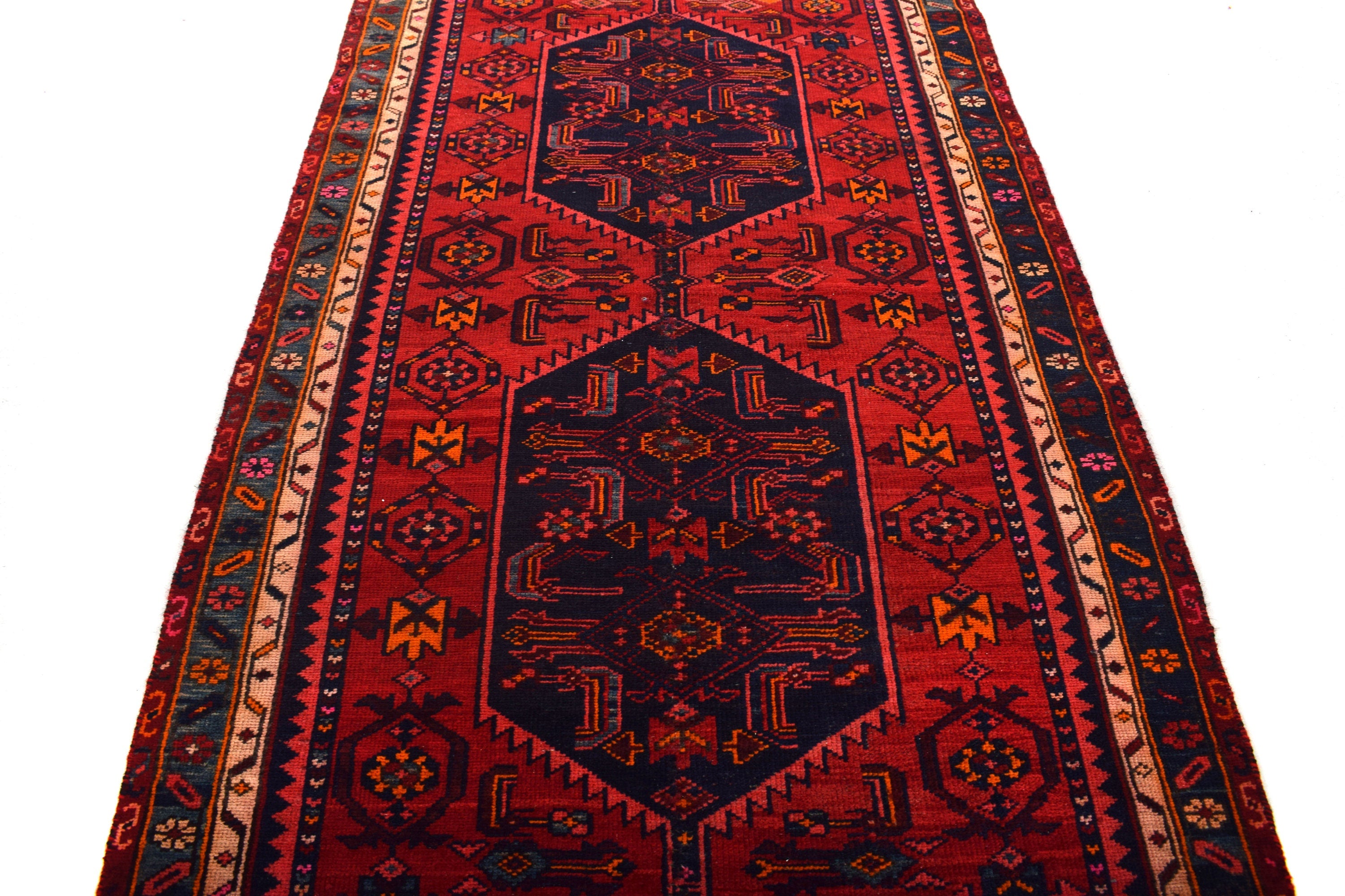 The vintage rugs in our collection have a rich and deep color palette and feature the characteristic design of a central pole medallion interspersed with geometric patterns and symmetrical shapes. Across their borders are often smaller bands encompassing a larger band with palm and leaf designs. A common theme in these rugs is geometric floral motives in various colors.