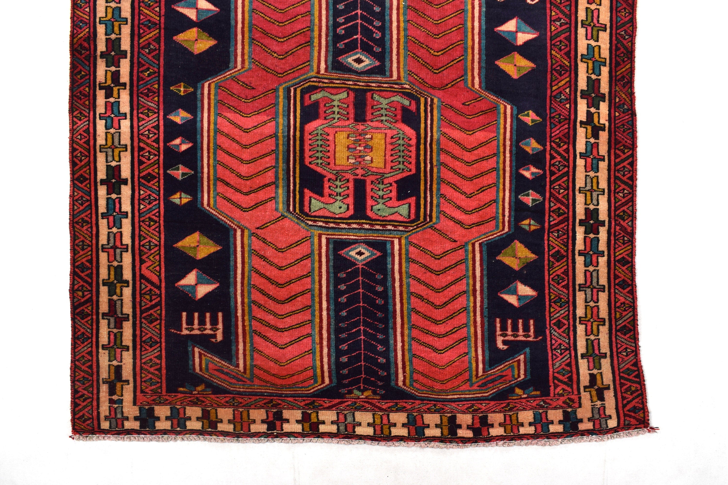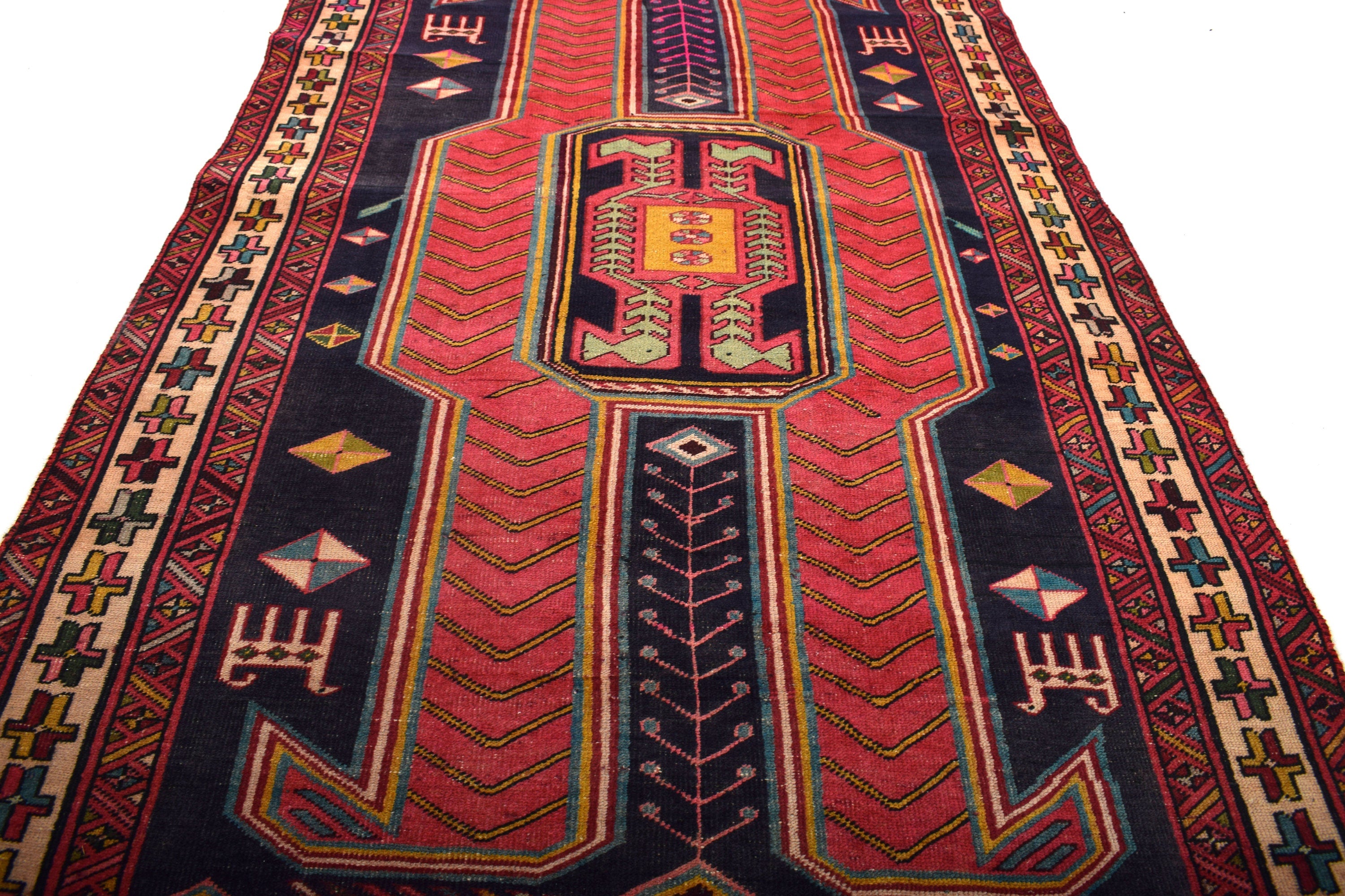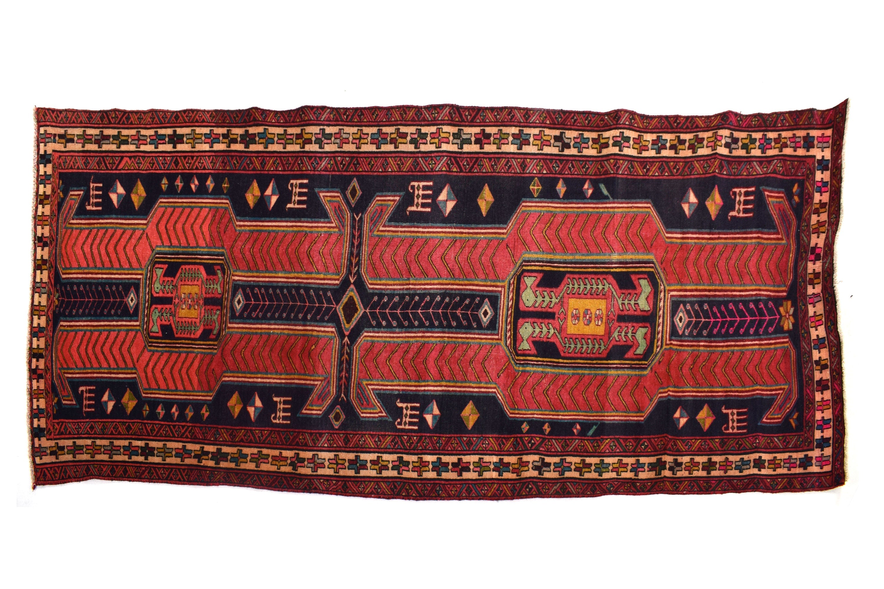 The vintage rugs in our collection have a rich and deep color palette and feature the characteristic design of a central pole medallion interspersed with geometric patterns and symmetrical shapes. Across their borders are often smaller bands encompassing a larger band with palm and leaf designs. A common theme in these rugs is geometric floral motives in various colors.