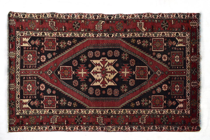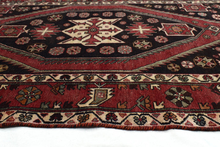 The vintage rugs in our collection have a rich and deep color palette and feature the characteristic design of a central pole medallion interspersed with geometric patterns and symmetrical shapes. Across their borders are often smaller bands encompassing a larger band with palm and leaf designs. A common theme in these rugs is geometric floral motives in various colors.