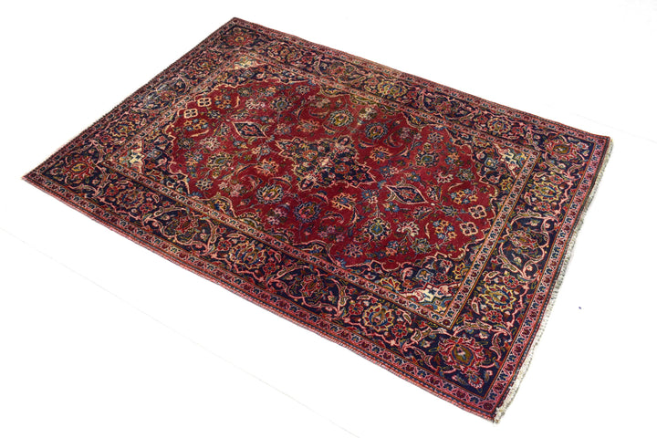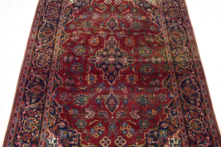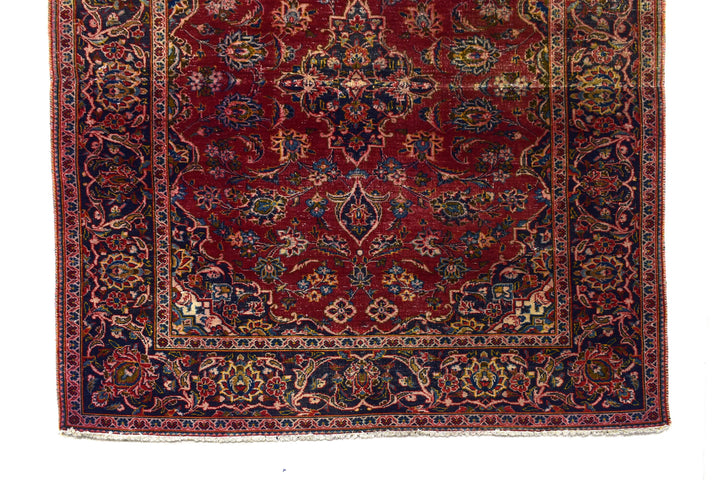 The vintage rugs in our collection have a rich and deep color palette and feature the characteristic design of a central pole medallion interspersed with geometric patterns and symmetrical shapes. Across their borders are often smaller bands encompassing a larger band with palm and leaf designs. A common theme in these rugs is geometric floral motives in various colors.