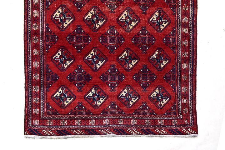 The vintage rugs in our collection have a rich and deep color palette and feature the characteristic design of a central pole medallion interspersed with geometric patterns and symmetrical shapes. Across their borders are often smaller bands encompassing a larger band with palm and leaf designs. A common theme in these rugs is geometric floral motives in various colors.