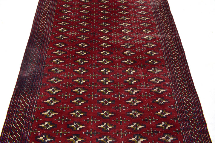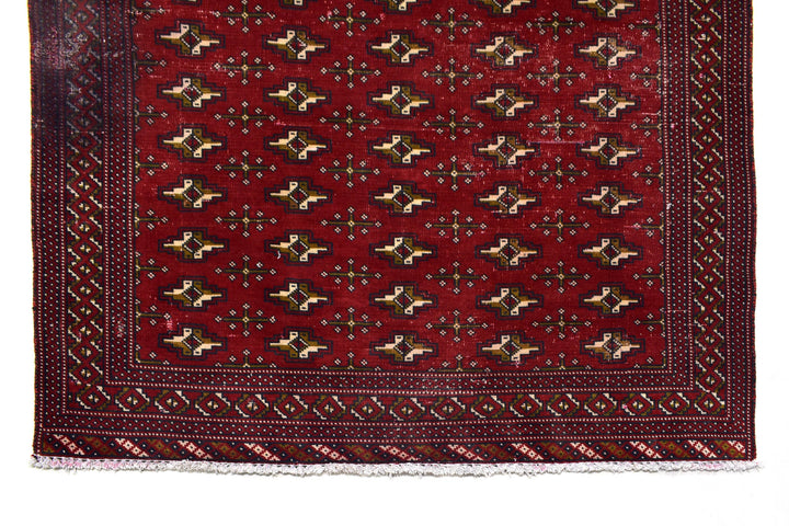 The vintage rugs in our collection have a rich and deep color palette and feature the characteristic design of a central pole medallion interspersed with geometric patterns and symmetrical shapes. Across their borders are often smaller bands encompassing a larger band with palm and leaf designs. A common theme in these rugs is geometric floral motives in various colors.