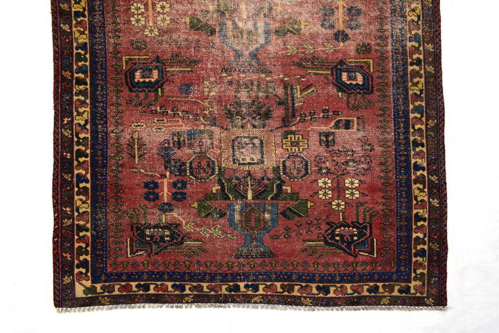 The vintage rugs in our collection have a rich and deep color palette and feature the characteristic design of a central pole medallion interspersed with geometric patterns and symmetrical shapes. Across their borders are often smaller bands encompassing a larger band with palm and leaf designs. A common theme in these rugs is geometric floral motives in various colors.