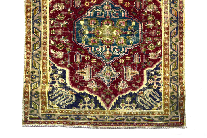 The vintage rugs in our collection have a rich and deep color palette and feature the characteristic design of a central pole medallion interspersed with geometric patterns and symmetrical shapes. Across their borders are often smaller bands encompassing a larger band with palm and leaf designs. A common theme in these rugs is geometric floral motives in various colors.