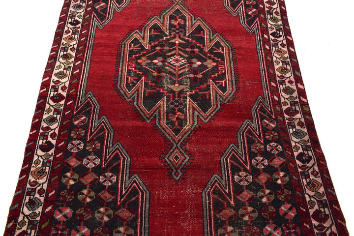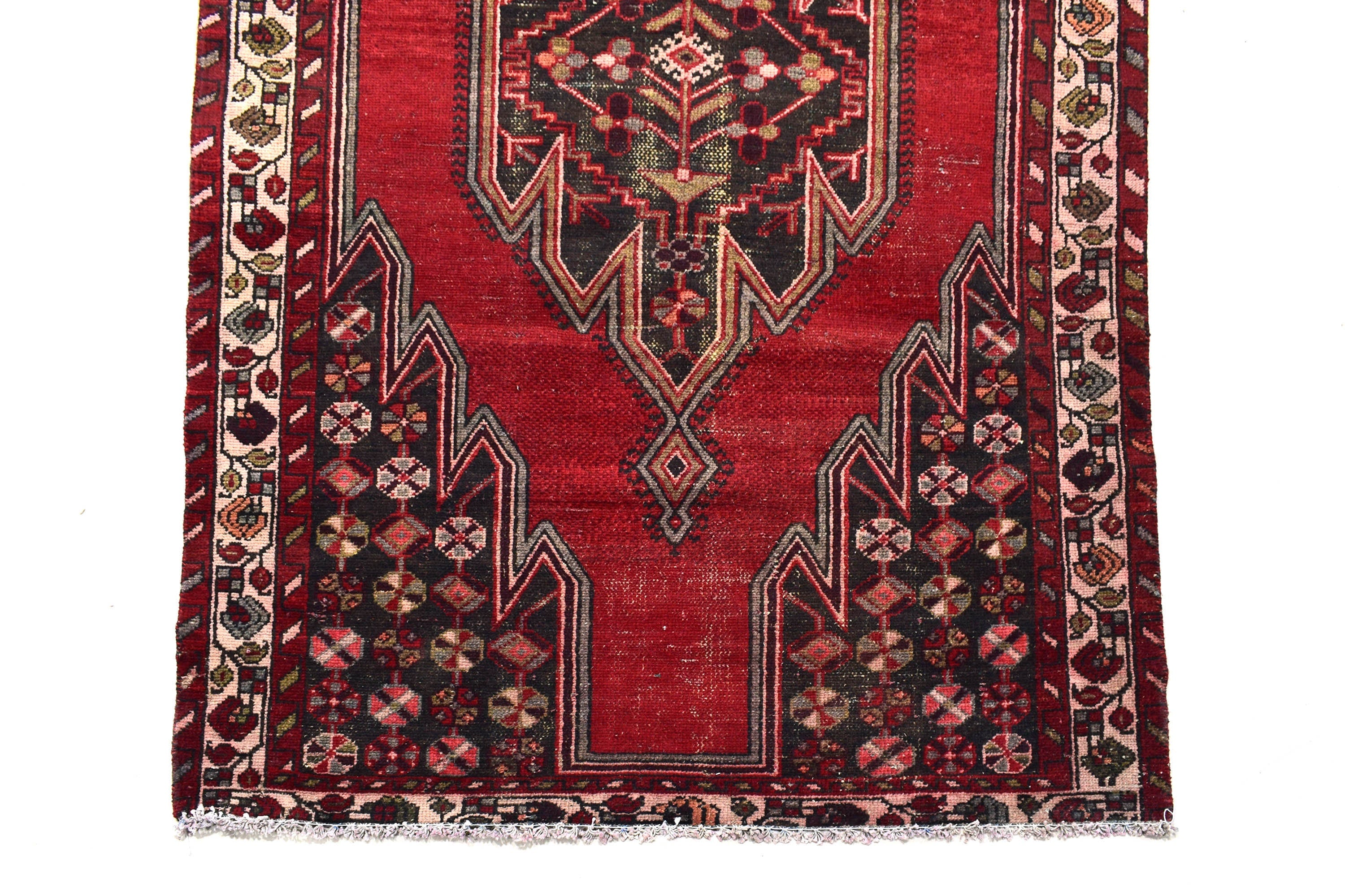 The vintage rugs in our collection have a rich and deep color palette and feature the characteristic design of a central pole medallion interspersed with geometric patterns and symmetrical shapes. Across their borders are often smaller bands encompassing a larger band with palm and leaf designs. A common theme in these rugs is geometric floral motives in various colors.