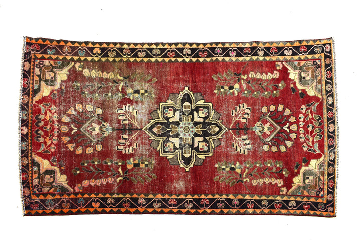 The vintage rugs in our collection have a rich and deep color palette and feature the characteristic design of a central pole medallion interspersed with geometric patterns and symmetrical shapes. Across their borders are often smaller bands encompassing a larger band with palm and leaf designs. A common theme in these rugs is geometric floral motives in various colors.