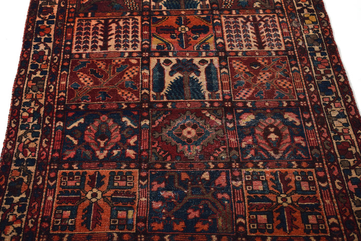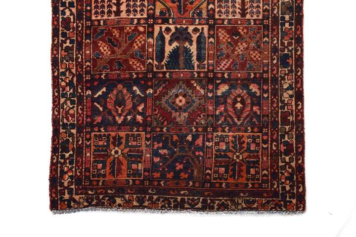 The vintage rugs in our collection have a rich and deep color palette and feature the characteristic design of a central pole medallion interspersed with geometric patterns and symmetrical shapes. Across their borders are often smaller bands encompassing a larger band with palm and leaf designs. A common theme in these rugs is geometric floral motives in various colors.