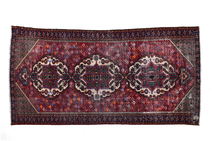 The vintage rugs in our collection have a rich and deep color palette and feature the characteristic design of a central pole medallion interspersed with geometric patterns and symmetrical shapes. Across their borders are often smaller bands encompassing a larger band with palm and leaf designs. A common theme in these rugs is geometric floral motives in various colors.