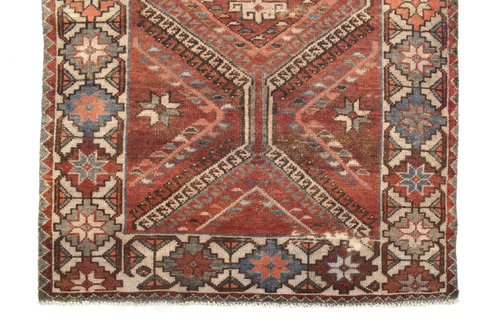 The vintage rugs in our collection have a rich and deep color palette and feature the characteristic design of a central pole medallion interspersed with geometric patterns and symmetrical shapes. Across their borders are often smaller bands encompassing a larger band with palm and leaf designs. A common theme in these rugs is geometric floral motives in various colors.